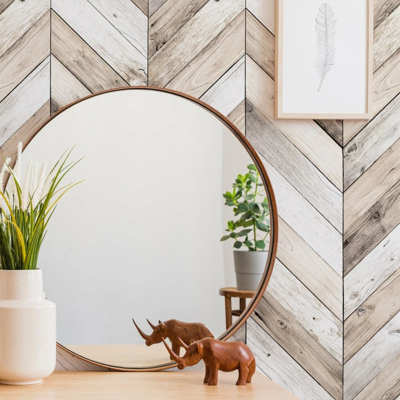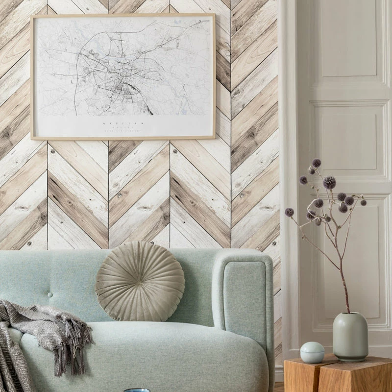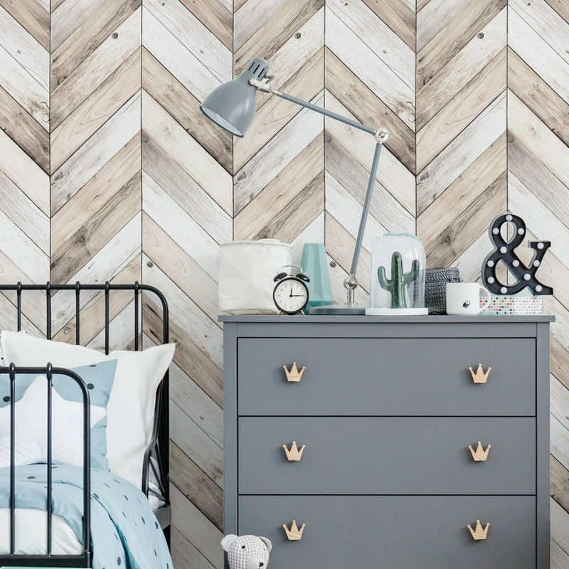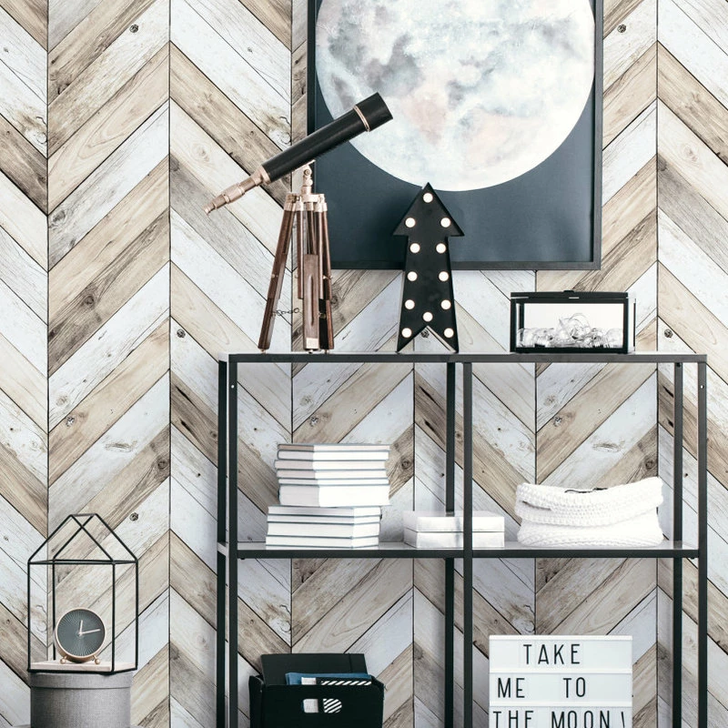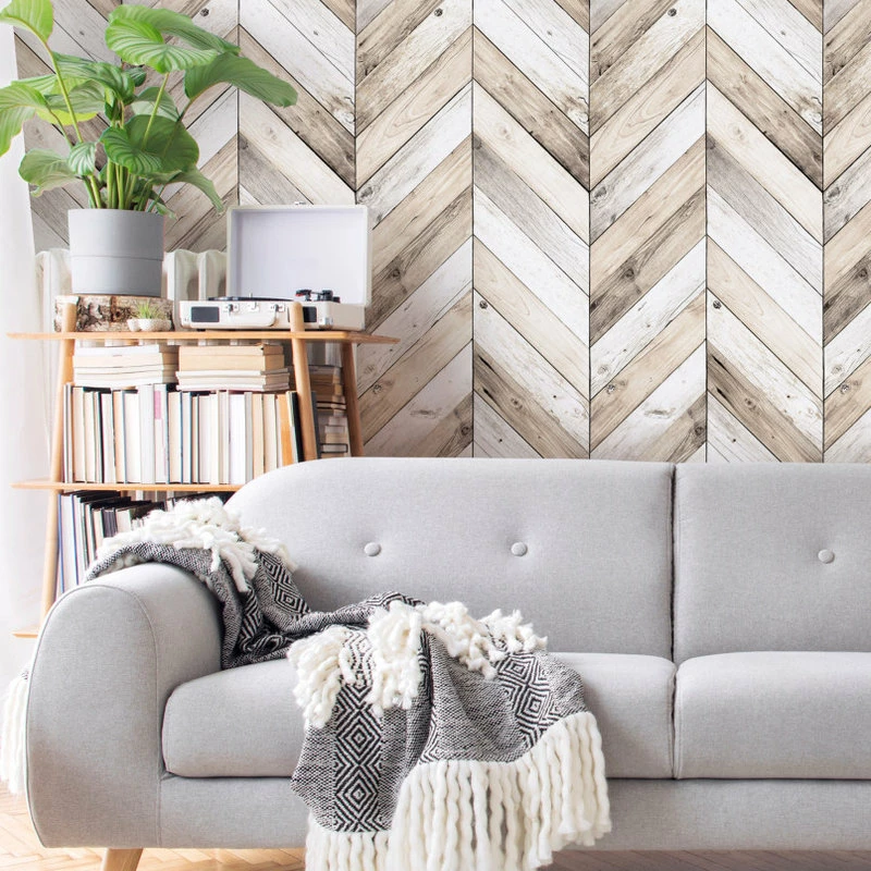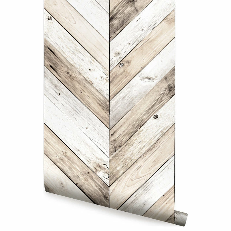 This is a light colored version of our very popular Chevron Wood Wallpaper. It features a stylish lighter tone herringbone pattern that adds airy warmth and character to any dรฉcor style โ from traditional to modern farmhouse and eclectic Boho-chic. Create the look of a wood plank wall without the wood saw, sandpaper, and splinters – just peel and stick!