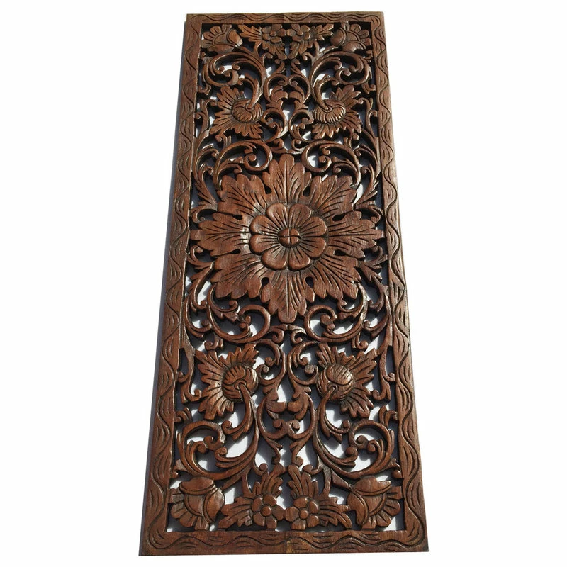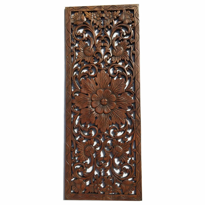 Large Wood Carved Panels. Perfect for large wall decoration. Floral wall art that will add beauty to any room. This carved wood plaque can be used as cabinet doors and vanities that will add beauty to your home. Made from teak wood. A product of Thailand that expresses a wonderful home decorative ambiance.