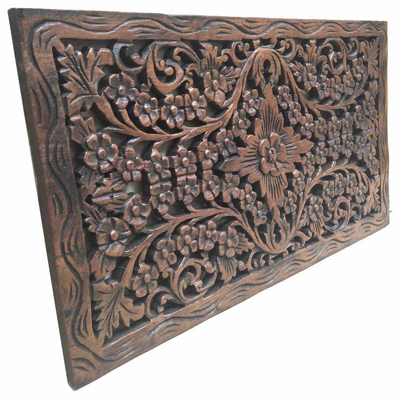 Oriental carved lotus wood plaque floral design in dark brown finish will add a captivating elegance to your room. They can be used as cabinet doors, window screens etc. Made from teak wood carved by fine Thai craftsman. Discover this exotic experience with your purchase of one or more of these magnificent treasures.