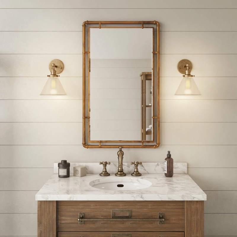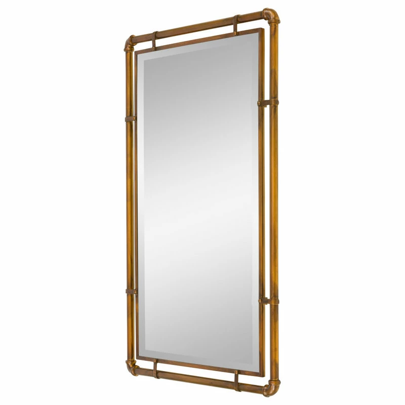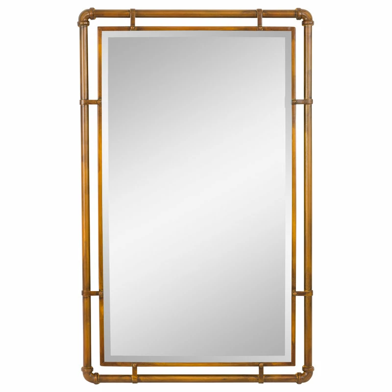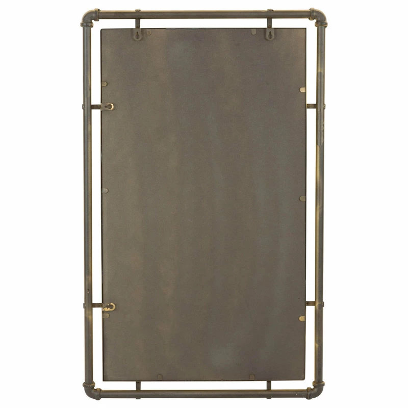 Featuring industrial inspiration, this iron mirror will shine whether used in your living space or as a bathroom accessory. Its design includes pipe ironwork with a beveled mirror in the middle. Industrial and modern spaces will benefit from this handsome piece.