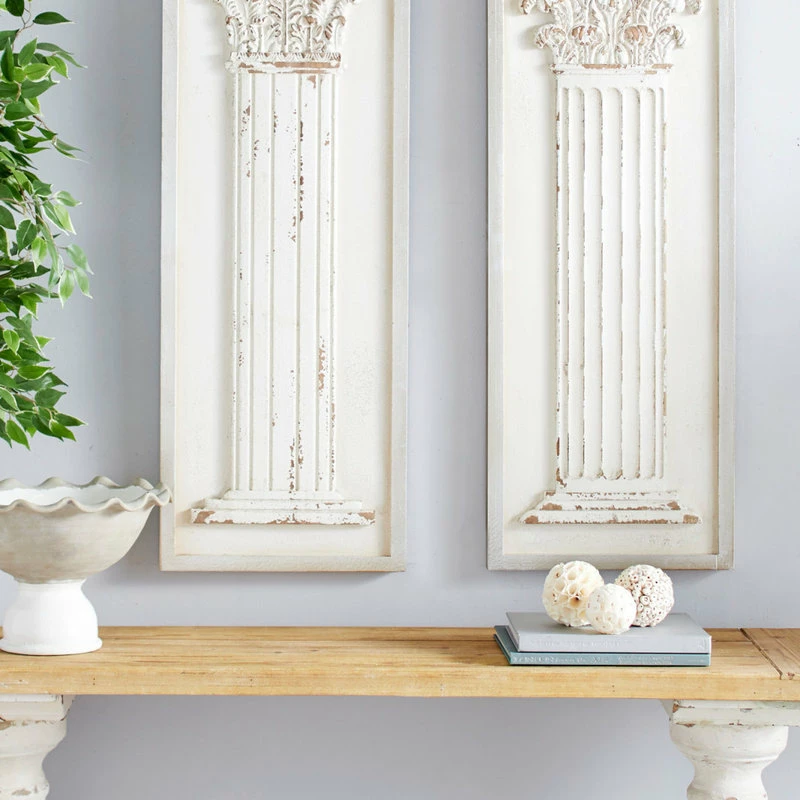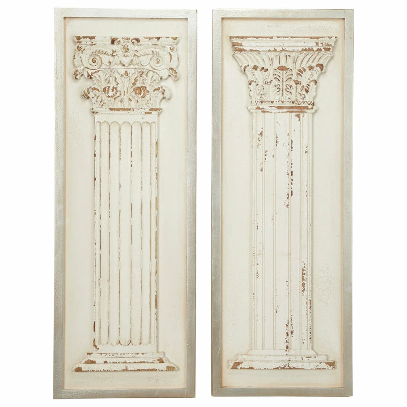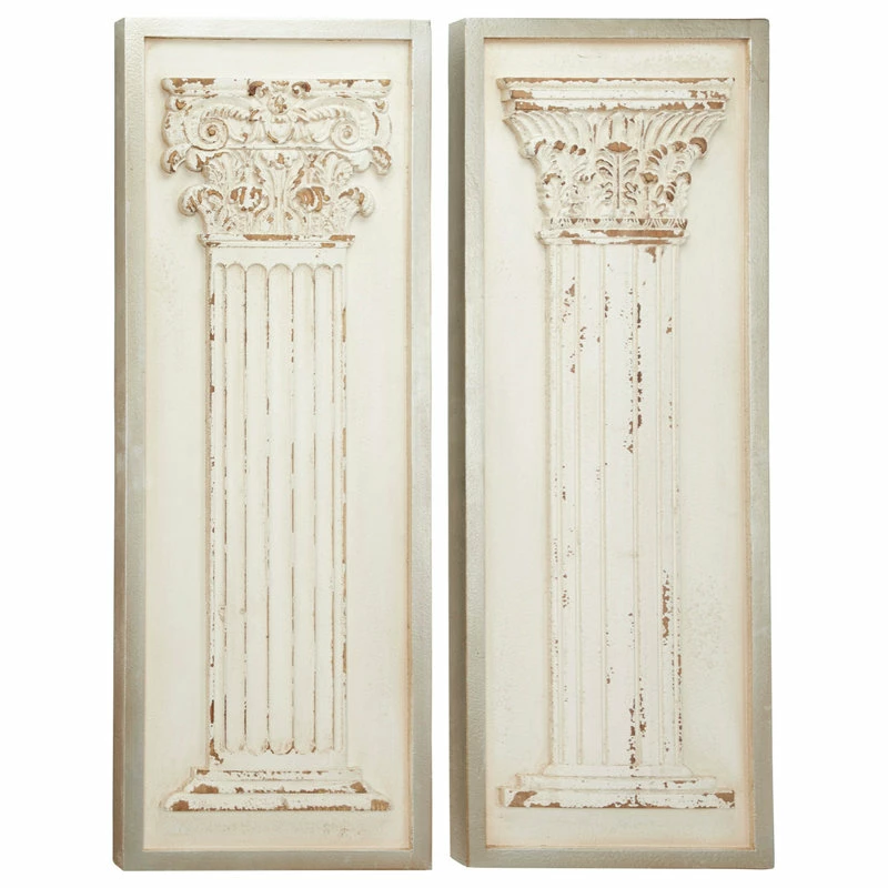 Add Hellenistic art style with a vintage look to any wall of your house with this set of 2 large, rectangular white wood wall decor pieces featuring carved Greek columns. Each column has decorative Corinthian-style carvings throughout their capitals, and both depict fluted columns. The distressed antique white finish over the natural Chinese fir wood carvings brings an antiquated look. This set of large wall decor is easy and ready to hang, and the neural hues of the eggshell white finish over the fir wood will work with any color palette. Easy and ready to vertically hang by metal hole hardware in back of each frame. Suitable for indoor use only. Each set comes with 2 Greek art wall decors. This item comes shipped in one carton.
