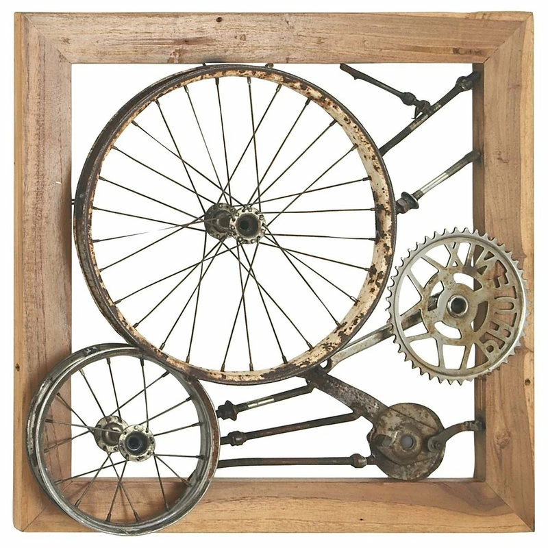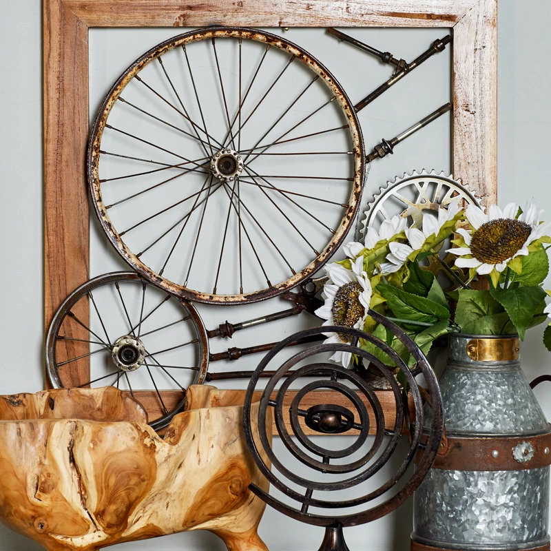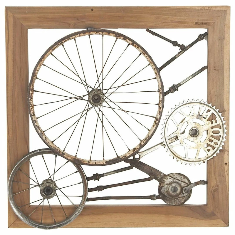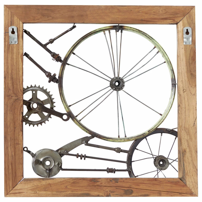 Accessorize your living space with this metal and wood gear wall Decor. This unique accent piece features a wooden frame with a square shape and stained wood finish. It is designed with gears and bicycle wheels in distressed metallic finishing. This wall decoration suits vintage and industrial themed spaces that crave for stylish home design. Hang this amazing piece anywhere you want and bring a relaxing and feel-good atmosphere to your home. There are keyholes on the back for easy hanging. Suitable for indoor use only. This item comes shipped in one carton. Made in Indonesia.