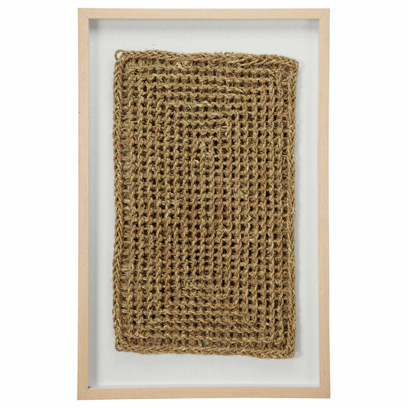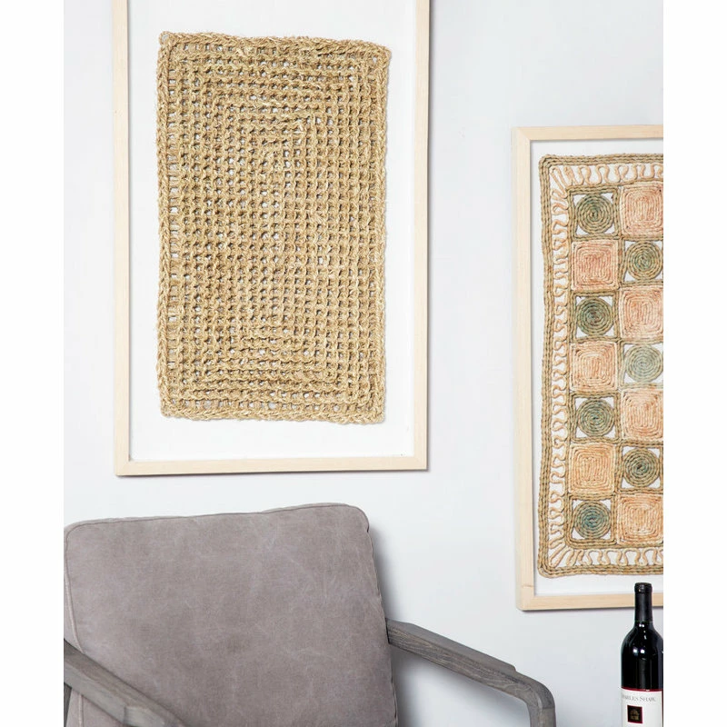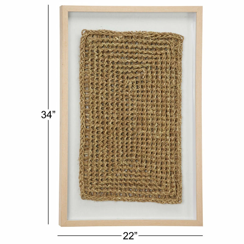 Natural, earth tones are spun throughout this textural, rectangular rope shadow box. Housed in a naturally light beige pine wood frame, this large rectangular wall decor piece displays a dimensional braided and chain linked rope with neutral wheat, beige, and light brown tones. Rich texture and dimension from the shadow box brings natural style to any wall while the versatile hues work with any color palette.