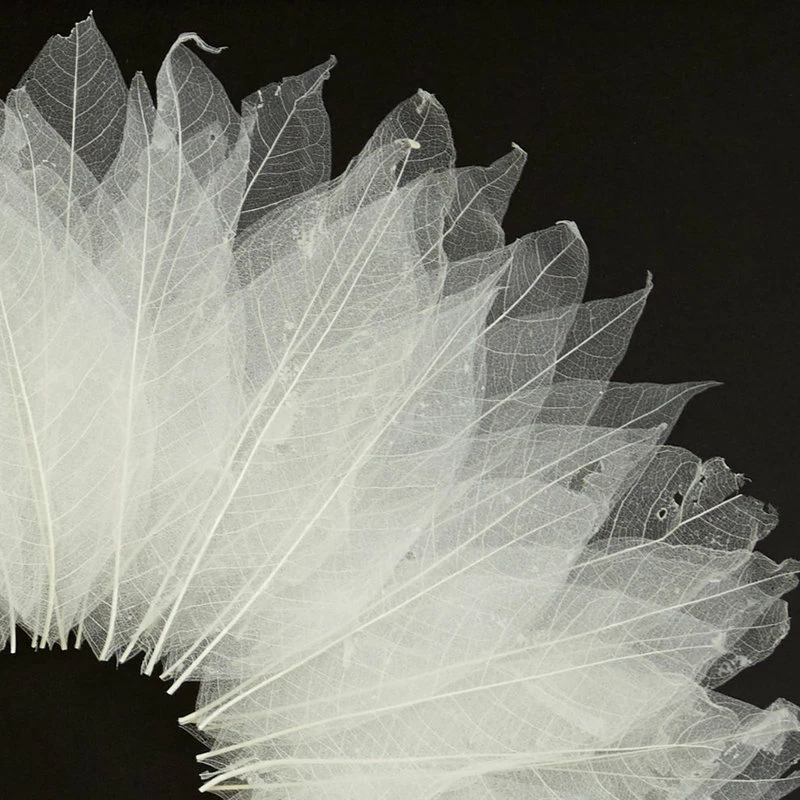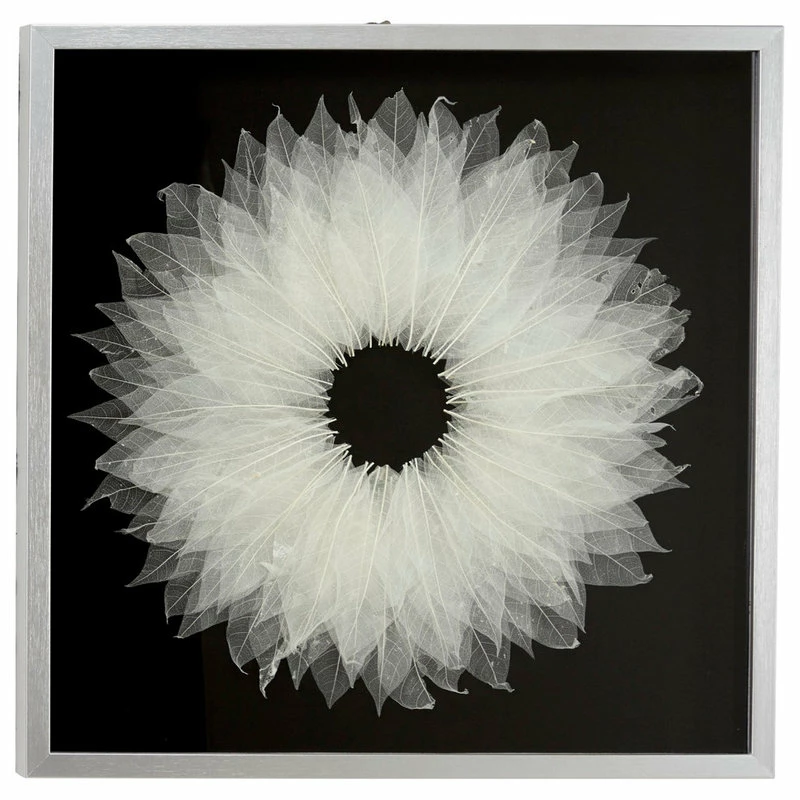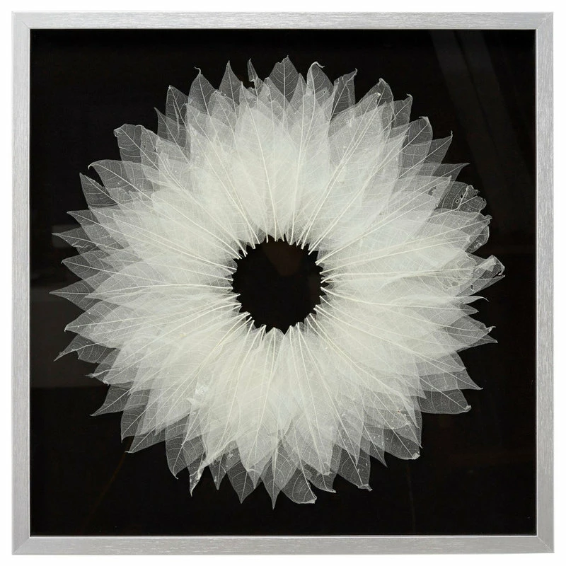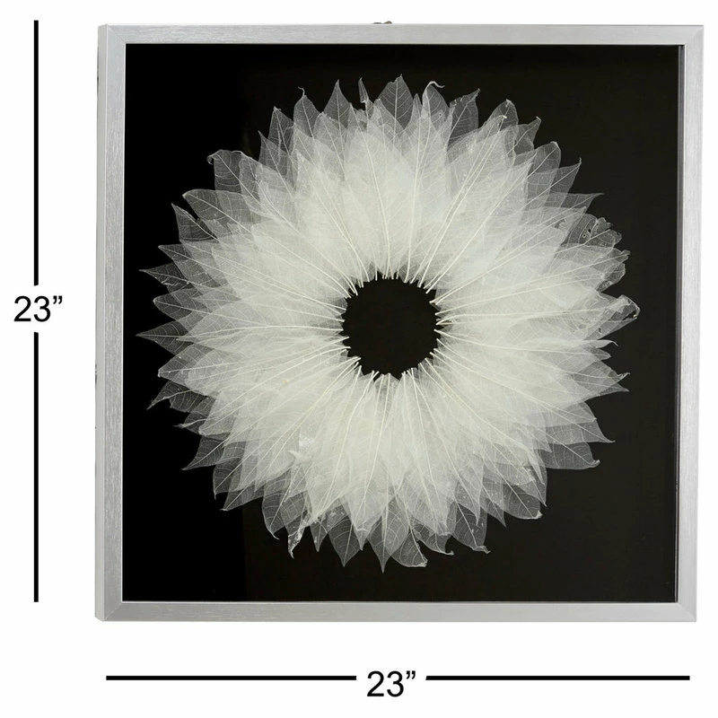 Statement wall art with botanical and natural style. Layers of long, translucent white leaves that look like delicate feathers are meticulously placed in a radial pattern forming a textural and gradient floral design. A square, textured silver frame houses this dimensional natural wall decor whose leaves really pop against the solid black background in the shadow box. The neutral silver, black, and white hues of this wall accent piece will work with any color palette in your space. Easy to hang by metal D-ring hardware in the back. Suitable for indoor use only. Contemporary theme. This item comes shipped in one carton.