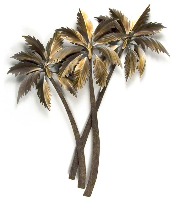 Enjoy the beachy bliss of a seaside paradise with our Palasari Palms Triple, a stunningly handcrafted contemporary metal wall art piece to add to your coastal home decor. Measuring in at 36in x 44in x 4.5in overall, this beach palm trees art is carefully crafted from formed, ground and painted metal, boasting creative detail, attractive depth and dimension, and artistic embellishments, all designed by the inspired artist Mark Malizia. This stainless steel landscape wall decor is hand-painted in metallic hues of brown, beige, tan, silver, and other subtle color variations and textures; unique enough to stand alone, yet versatile enough to complement your existing decorations and home furnishings. If you are looking for coastal decorating ideas, this pleasantly contemporary piece is recommended for indoor and covered outdoor placement, and would make a beautiful display in your kitchen, dining room, living room, nursery or bathroom with nautical, coastal, casual or eclectic themes, with a bit of a contemporary flair.
