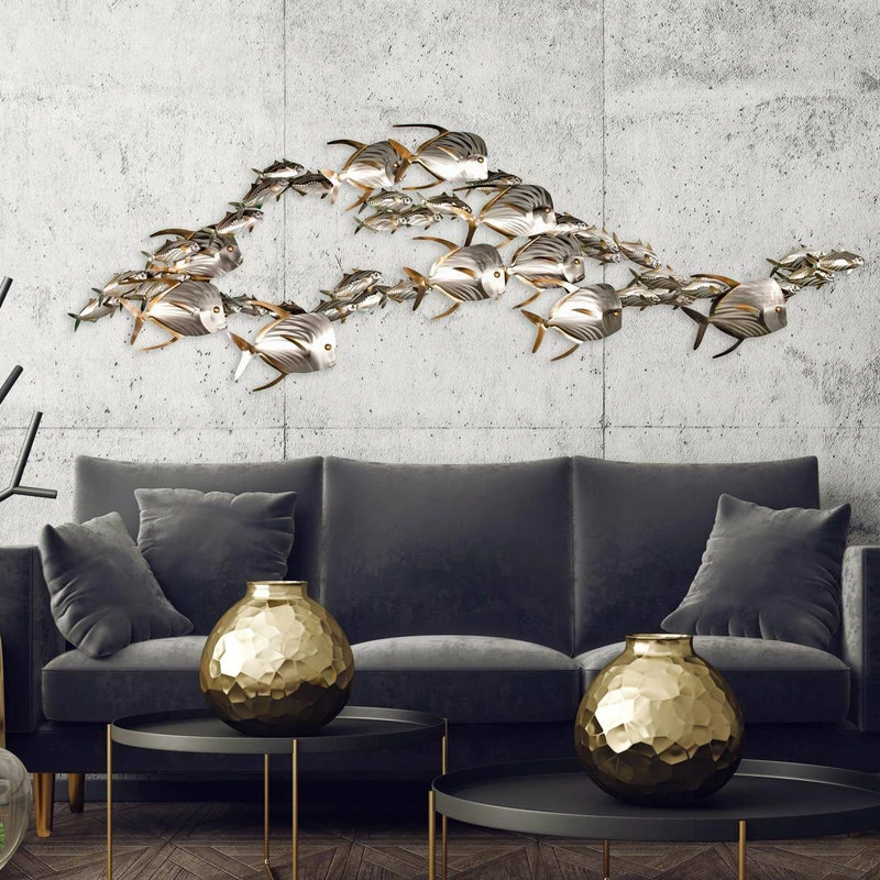 Enjoy the beachy bliss of a seaside paradise with our Sardines School XL, a stunningly handcrafted nautical metal wall art piece to add to your coastal home decor. Measuring in at 85in x 29in x 6in overall, this contemporary school of fish art is carefully crafted from formed, ground and painted metal, boasting creative detail, attractive depth and dimension, and artistic embellishments, all designed by the inspired artist Mark Malizia. This stainless steel sea life wall decor is hand-painted in metallic hues of silver, bronze, beige, brown, and other subtle color variations and textures; unique enough to stand alone, yet versatile enough to complement your existing decorations and home furnishings. If you are looking for coastal decorating ideas, this pleasantly nautical piece is recommended for indoor and covered outdoor placement, and would make a beautiful display in your kitchen, dining room, living room, nursery or bathroom with nautical, coastal, casual or eclectic themes, with a bit of a contemporary flair.