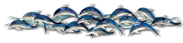 Express your love for the coast with a contemporary twist! Wave Dancers is a stunningly handcrafted ocean metal wall art piece that seamlessly accentuates both modern and coastal home decor. Measuring in at 80in x 15in x 3in overall, this tropical dolphin art is crafted from formed, ground and painted metal, boasting creative detail, attractive depth and dimension, and artistic embellishments, all designed by the inspired artist Joanne Ferrara. This stainless steel sea life wall decor is hand-painted in metallic hues of royal blue, silver, copper, turquoise, and other subtle color variations and textures; unique enough to stand alone, yet versatile enough to complement your existing decorations and home furnishings. If you are looking for a coastal theme without sacrificing your modern, progressive taste, this pleasantly nautical piece is suitable for indoor and covered outdoor placement, and would add some artistic contemporary flair your kitchen, dining room, living room, or bathroom with coastal, tropical, casual or eclectic themes.