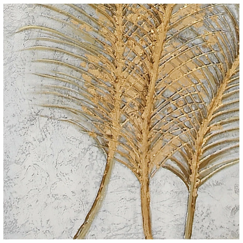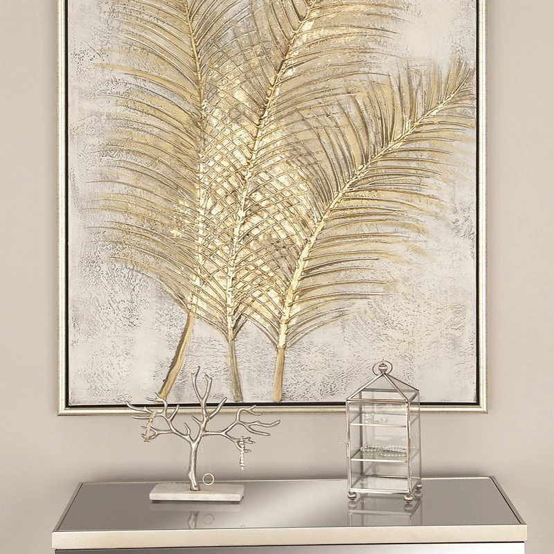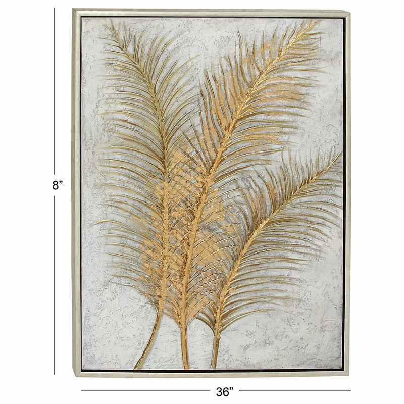 This wall art exude natural beauty and sophistication in both color and composition. Showcase your personality and turn your walls into an art gallery with this impressive wall art. Add a bold statement to your living room or bedroom space with this palm leaf wall art that complements your wall sconces, indoor plants, or console tables for a chic upgrade to your glam interior. This item ships in 1 carton. Easy and ready to hang vertically with sawtooth hook at the top of the frame; nails and screws are not included. Suitable for indoor use only. This is a single framed wall art. Glam style.
