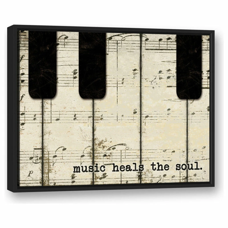 This premium floating framed canvas features a black and white vintage piano key and music note background design. The wall art is printed on professional grade tightly woven canvas with a durable construction, finished backing, and is built ready to hang. The result is a remarkable piece of wall art that will add elegance and style to any room.