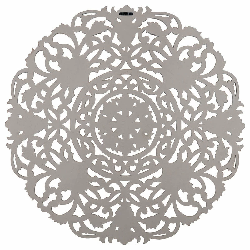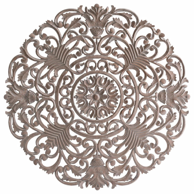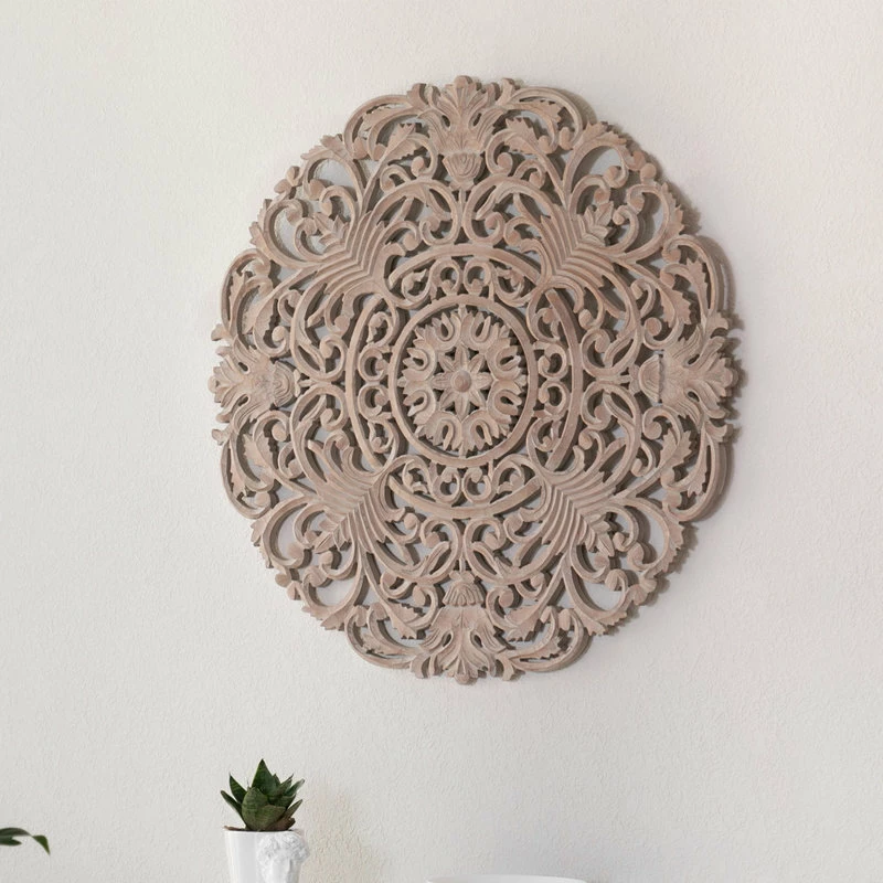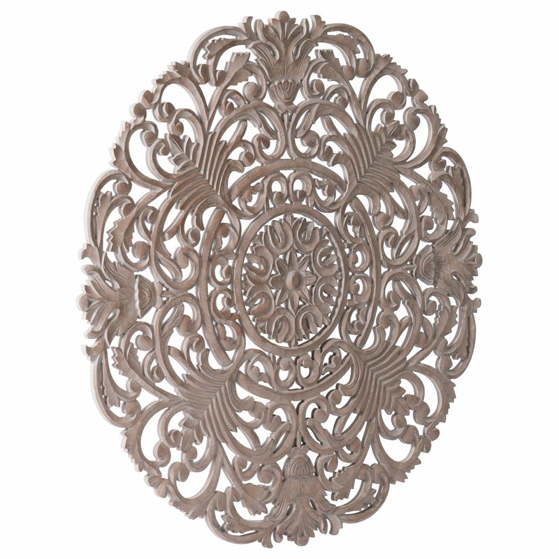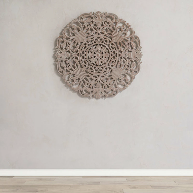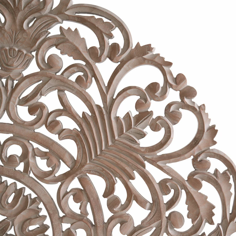 Celebrating the artistic energy of a mandala, this wall medallion wholly captures the balance of bilateral symmetry. Intricately hand-carved out of engineered wood, the detailing of flowers, petals, and vines reflect skilful craftsmanship. The engineered wood is wittingly distressed to evoke vintage elegance.