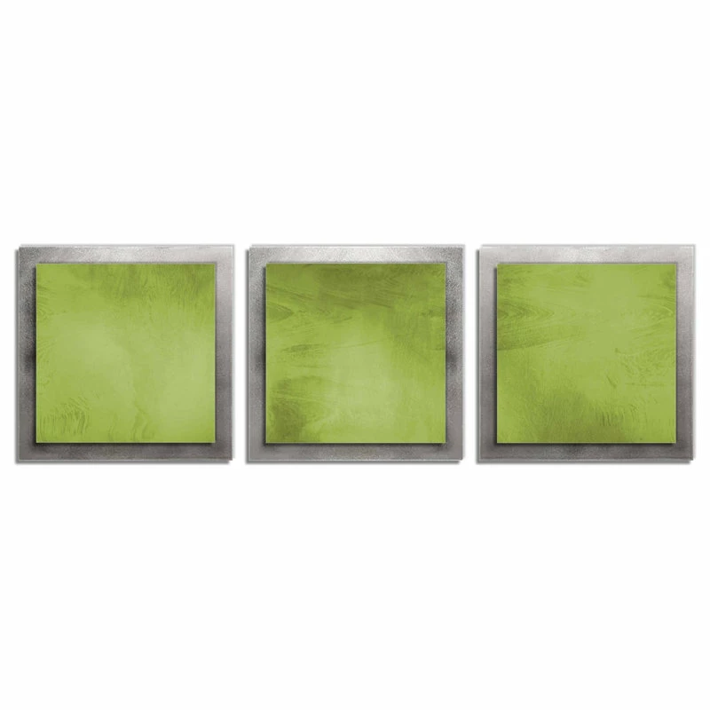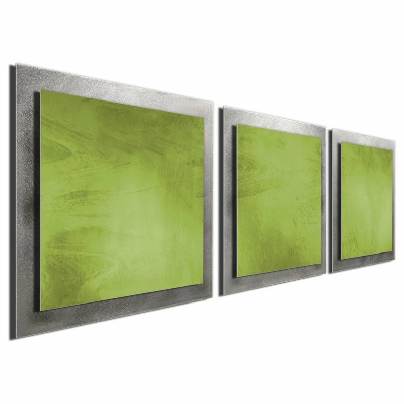 The Green Essence modern art wall sculpture boasts a crisp green color palette. This metallic accent was designed by world-renowned metal artist Nicholas Yust. The raised, layered panels of this triptych sculpture add a lot of character to a minimalist design. The forest, lime and pastel green color tones of this metal painting represent an organic look and feel, with shades of green commonly being associated with Nature. The satin matte coloring process features subtle swirling patterns. These multi-panel metal wall sculptures allow for flexibility in orientation: some choose a traditional horizontal line, others prefer a vertical line, while others still arrange the metal panels in a more sporadic or random layout. Regardless of the orientation on your wall, the beautiful design and colors of Green Essence will be an eye-catching addition to your wall as the artwork accents the decor of any modern, contemporary or abstract home or office.