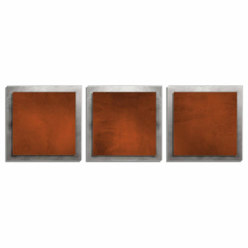 Rusty Essence is a dual-layered metal art design. The multilayer and multi-panel combinations create sculptural depth and intriguing shadowing, giving this contemporary wall decor an added element that is missing from typical flat wall art. The set-back, rear layer has a grind pattern texture applied to create an interesting framed backdrop. The raised front layers feature a reddish-brown raised accent similar in color to rusted iron. A huge contrast from the bright shine of the swirled metal backing, the satin matte rusty color reminds that even the toughest materials can be corroded and become brittle through the exposure to harsh elements and time. The brilliant theme on this piece gives observers the chance to see the very essence of life – from ashes to ashes, from dust to dust. This modern design will be an outstanding piece that will add character to any urban space.