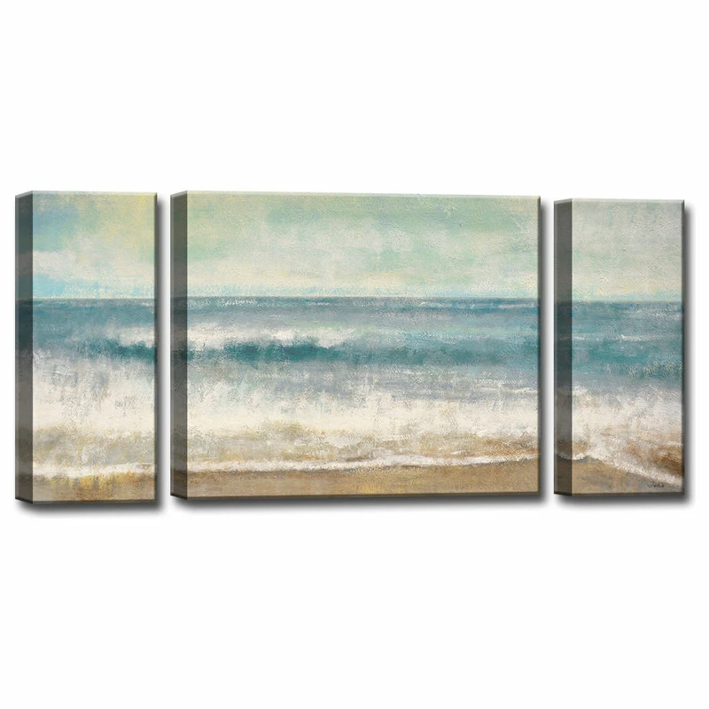 “Relax upon Beach Memories’ by Norman Wyatt Jr. The serene scene of the ocean softly breaking its waves on the shore create nostalgia of summer days. Rejuvenate your space with this Ready2HangArt three-piece gallery wrapped canvas art set. The center panel measures 30-in high by 36-in wide, and the two side panels measure 30-in high by 12-in wide, with an overall dimension of 30-in high x 60-in wide, for a perfect fit over a living room sofa or signature wall.
