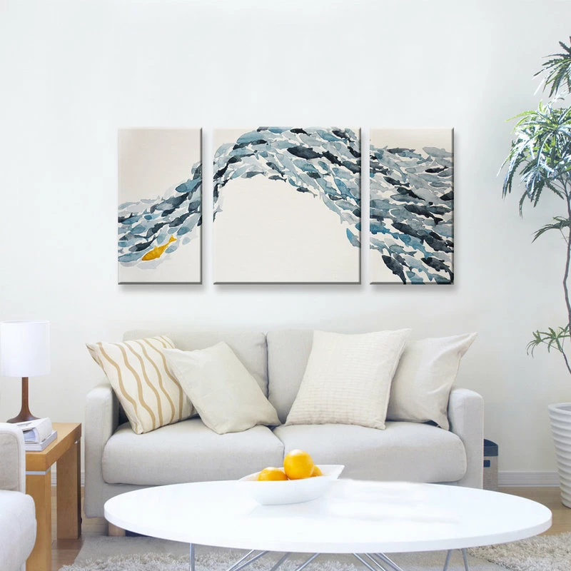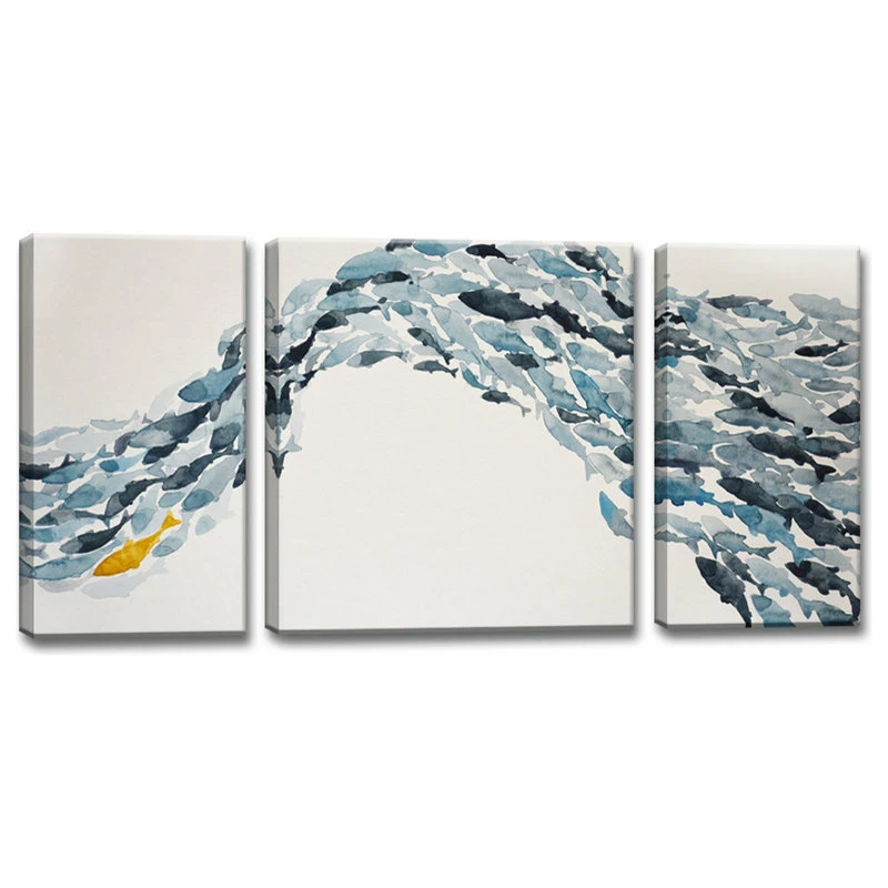Harmonious migration streams in Goldfish’ by Norman Wyatt Jr. The exquisite group of goldfish shoaling as one, socially protect one another while the oddity in gold radiates beauty bewildering onlookers in this Ready2HangArt three-piece gallery wrapped canvas art set. The center panel measures 30-in high by 36-in wide, and the two side panels measure 30-in high by 12-in wide, with an overall dimension of 30-in high x 60-in wide, for a perfect fit over a living room sofa or signature wall.