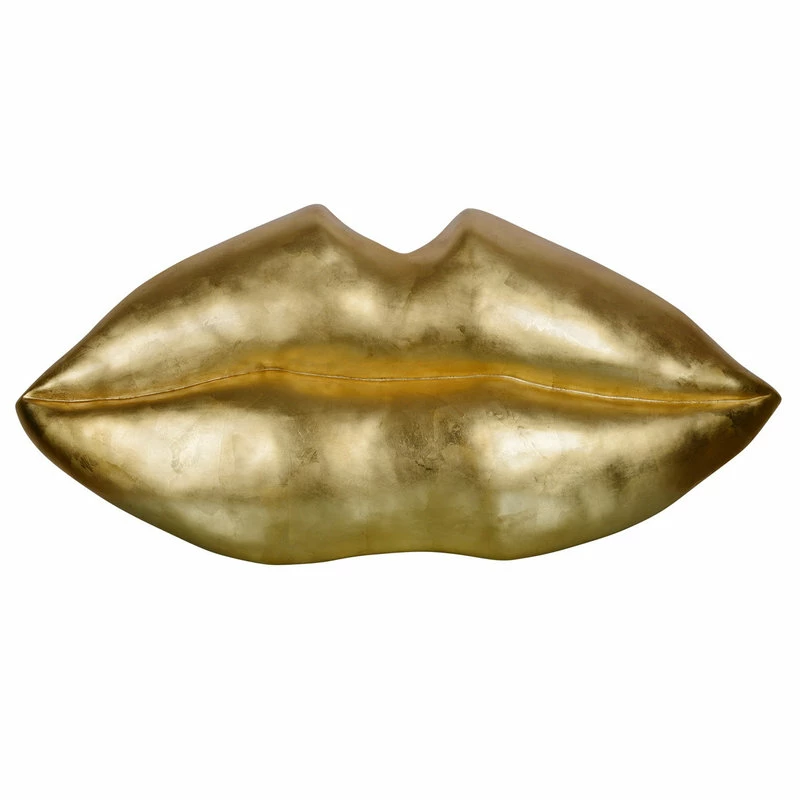 Add a smooch of sparkle with this modern wall decoration. A luscious pair of lips are formed in resin and finished in gold leaf for a kiss of pure glamour. The sculptural shape of the mouth makes for a whimsical wall accessory with an affectionate twist.