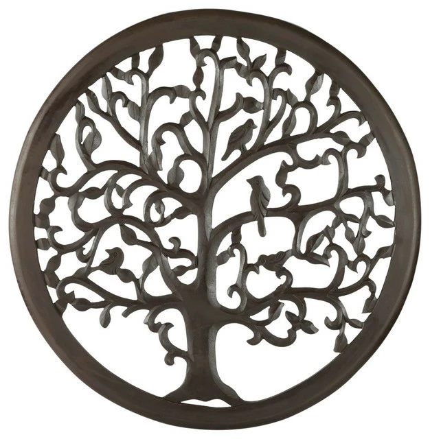 The Solaris Ten handcrafted wooden wall panel is patterned after an ancient Tree of Life design. This hand carved round wall medallion showcases a detailed motif of intricately carved branches, leaves, and hidden birds of the Tree of Life. The concept of the Tree of Life spans widespread roots in the history of the world’s mythologies, religions, and philosophies. With its rustic dark brown finish, the Solaris Ten wall panel is ready to mount on any open wall space with its hanging hardware mounted on the reverse of the panel. Measures 24x24x1″