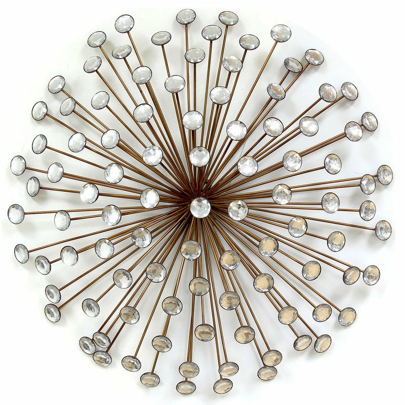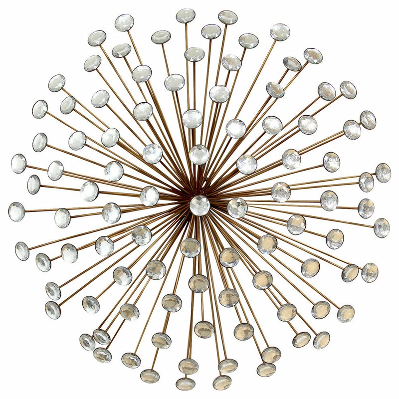 This decorative wall centerpiece features metal spikes bursting outwards, each one colored with a gorgeous bronze finish. At the tip of each spike is an acrylic embellishment, which sparkles and shines when it gets hit by natural or ambient light.
