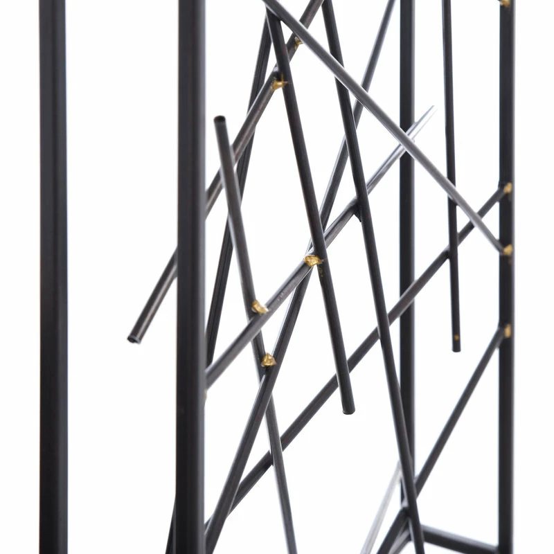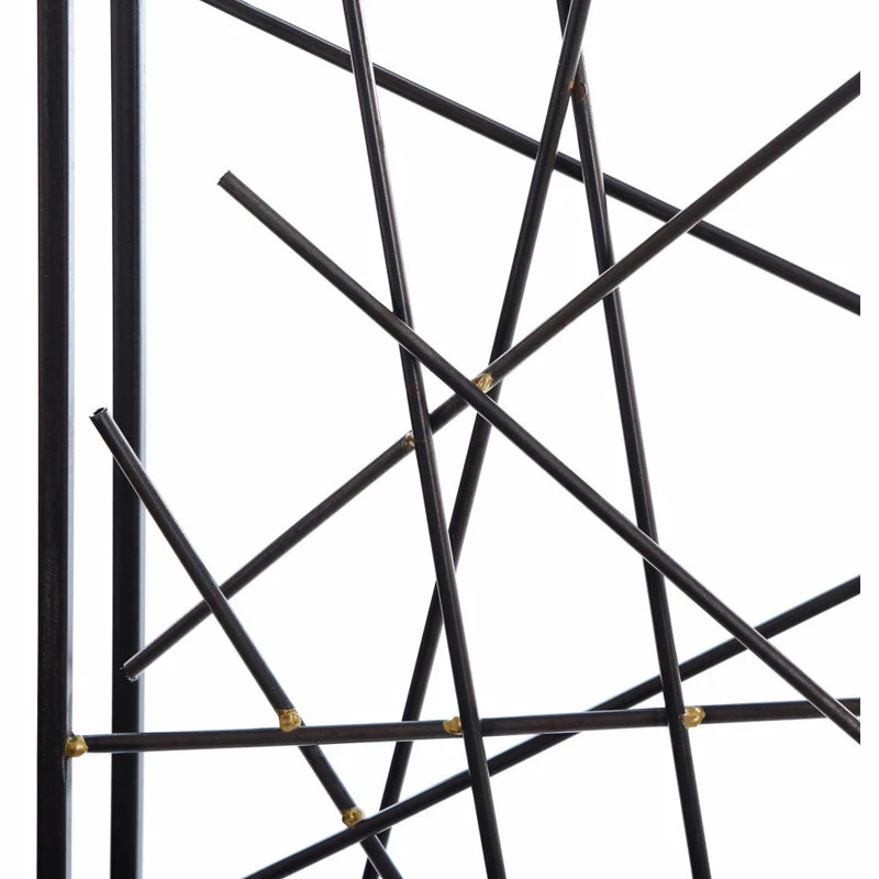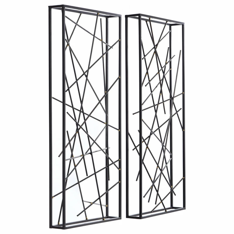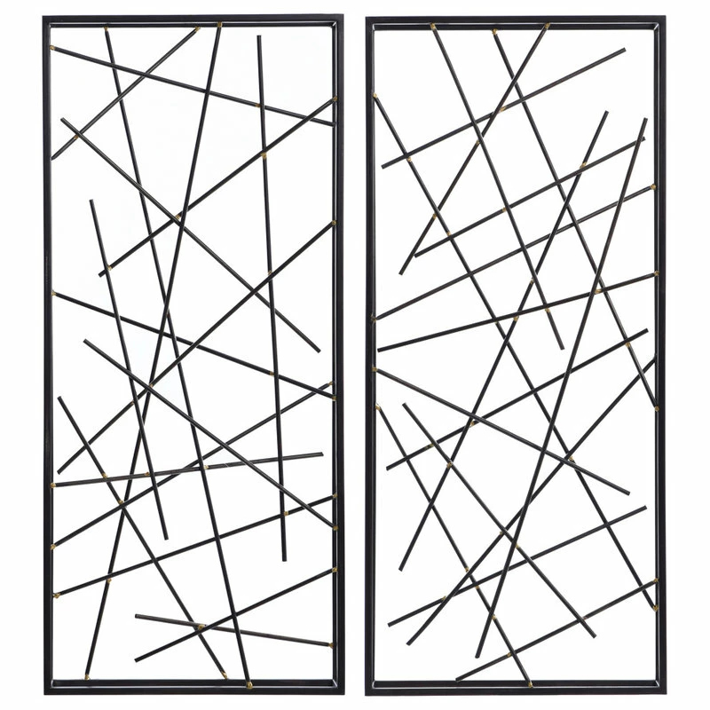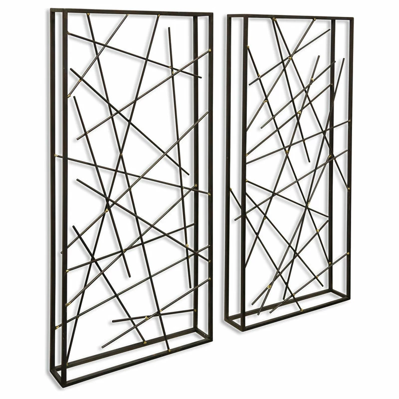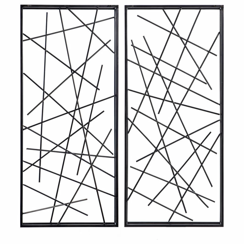 A bold and versatile accent for the modern home, this set of contemporary metal wall sculptures use minimalist elements and strong lines to create visual impact. A set of two panes, each piece is finished in a black tone with a rectangular outer frame that displays a series of overlapping rod accents. It’s a ready to hang way to bring out the “wow” factor in the contemporary room.