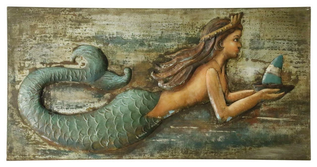 This handmade piece of three-dimensional iron wall art depicts a stunning aquatic scene. The central figure is a lovely mermaid with flowing brown hair and a green tail; she’s holding a small boat with white and blue sails. Sure to be the focal point of any space, this multicolored iron wall art is ideal for an office, hallway, living room, dining room, or bedroom.