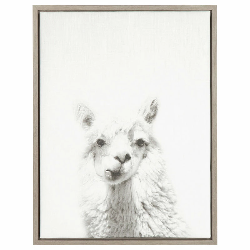 - Decorative black and white alpaca portrait printed on framed gallery wrapped canvas