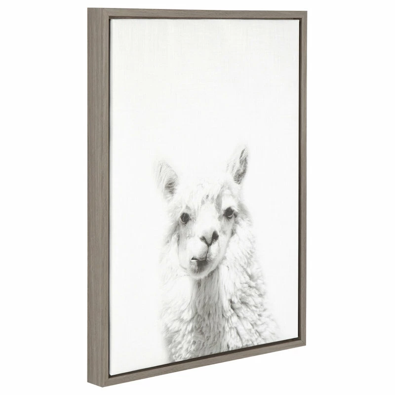 Bring the beauty of nature in its pure elemental form into your home with this striking alpaca portrait. Printed and framed in the USA in Waunakee, Wisconsin, this framed floating canvas art will be pure pleasure to look at every day in your living room, bedroom, nursery, or any room in the home. Printed on gallery wrapped canvas and framed with a gray woodgrain polystyrene frame, this animal wall art has two hangers already attached to the black MDF back for easy wall display. The outer dimensions are 24 inches tall by 18 inches high by 1.5 inches deep.
