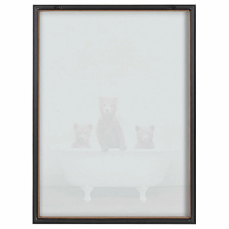 Get your baby bear ready for bathtime with these furry little friends! Framed in a sleek modern frame, this contemporary design is the perfect art piece to add to your home decor collection. Printed and framed in the USA in Waunakee, Wisconsin, this printed glass art will be a pleasure to look at every day in your living room, bedroom, office, or any room in the home. This print also makes an excellent gift for a birthday, holiday, or house-warming. It also has two hangers already attached for easy wall display. The outer dimensions are 24 inches by 18 inches. Print Name: โThree Little Bears in Vintage Bathtubโ