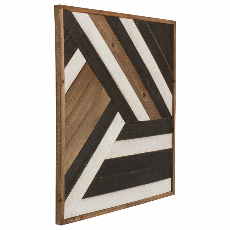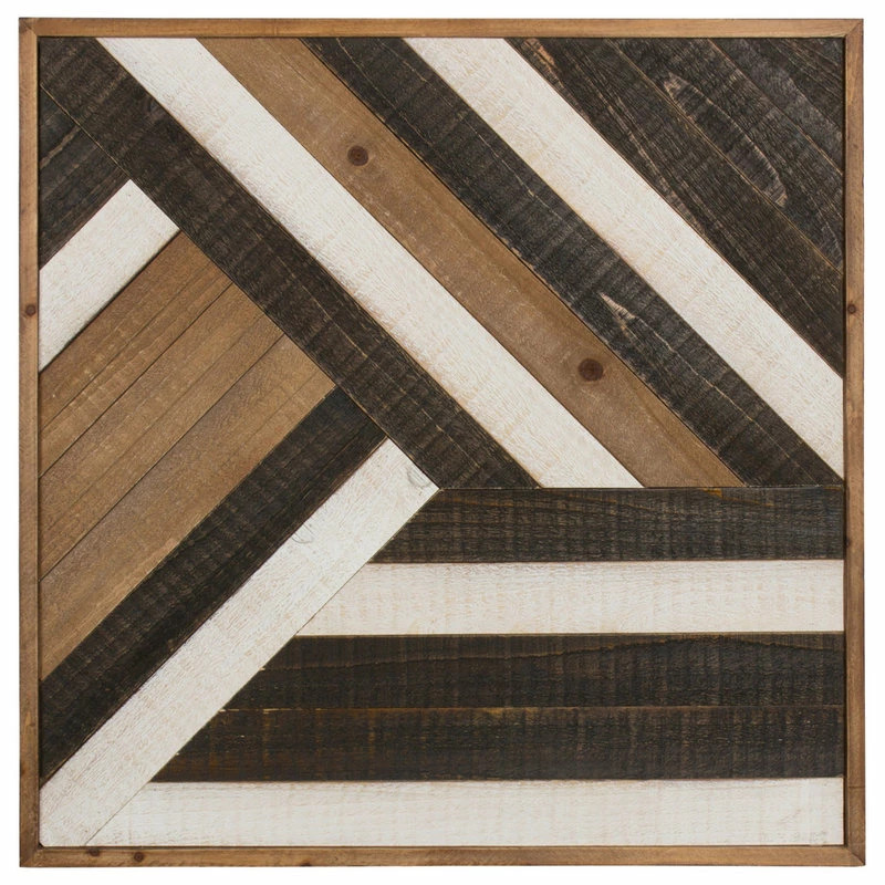 Decorate your rustic chic home in style with this geometric pieced plank wood wall art plaque. Featuring alternating planks of distressed white, black, and rustic brown in a modern geometric design and framed in rustic wood, this gorgeous wall art plaque will bring a beautiful statement in any room of the home. This wood wall art plaque measures 23.75 inches square and has a depth of 0.75 inches from the wall. This wall plaque has two hangers already attached to the back-this gorgeous wall art is ready for display! It will fit beautifully in a bedroom above a headboard or dresser, above your desk or work station in your home office, or above a sofa to bring rustic warmth into your living space.