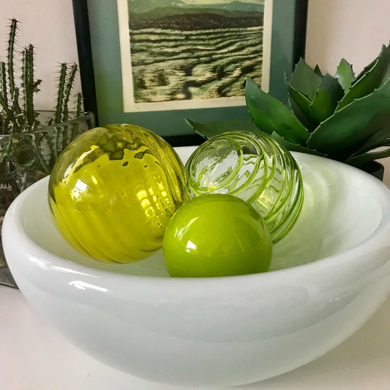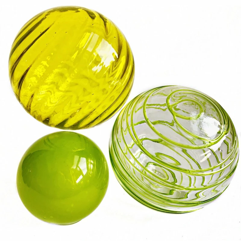 This set of 3 artisan blown glass spheres is perfect to group in a small bowl. The set comes with stabilizing rings to keep the spheres in place or hooks to mount them on a wall. Sparkling twirled yellow, vibrant lime green threads and a combination of yellow and green making the whitewashed guacamole.