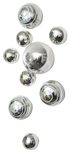 An assortment of silver-plated, hand-crafted, blown glass spheres that will fit beautifully in a small space like a bathroom wall or over a nightstand or in a bookcase. The mirrored effect is achieved by swirling silver nitrate inside each sphere – this will not wash off as it is on the inside of the sphere. As shown this set is approximately 3 feet in length.