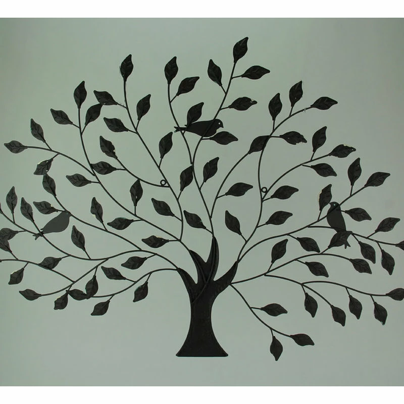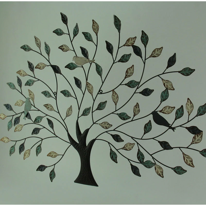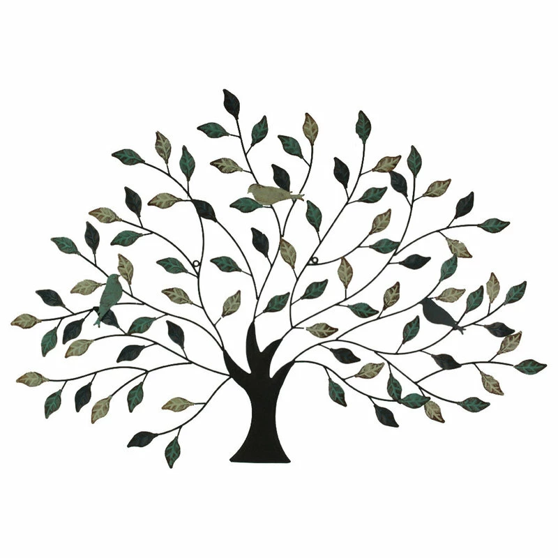 Taking inspiration from nature, this wall hanging puts an artistic twist on the tree with its willowy branches and large leaves. Made from metal, it is a creative design that is easy to install on just about any wall with built-in hangers, and the tri-tone finish in shades of green, off-white, and brown adds a subtle touch of color. Display it on a focal wall anywhere indoors or let it greet your guests outside near the front entry. Hang it by the pool, on the patio, or on a fence to bring a touch of sunshine to your yard or garden. This 35.75-inch long, 26.25-inch high wall sculpture brings personality, character, and artful inspiration to your indoor or outdoor home decor.