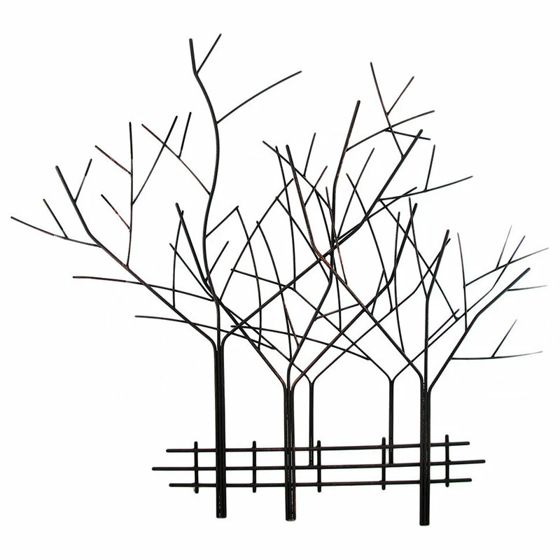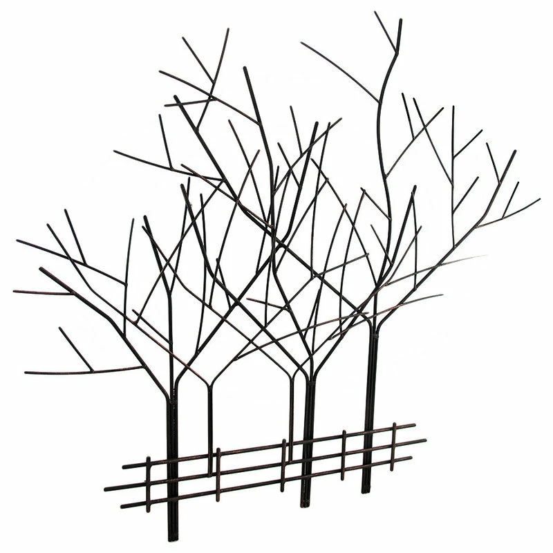 This wonderful metal wall hanging features barren winter trees in a fenced field. Made of rolled steel bar of various diameters, the stark branches are soldered to the triple wide trunks. The wall hanging has an aged copper brown finish, and really stands out against solid color painted walls. It measures 24 inches tall, 26 inches wide, and hangs to your wall by nailing small nails on 2 of the junctions where branches cross.