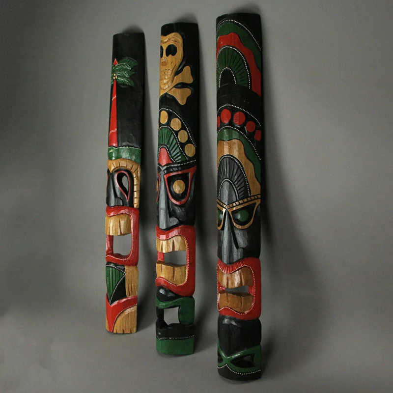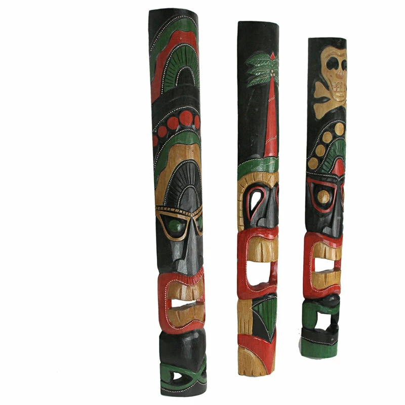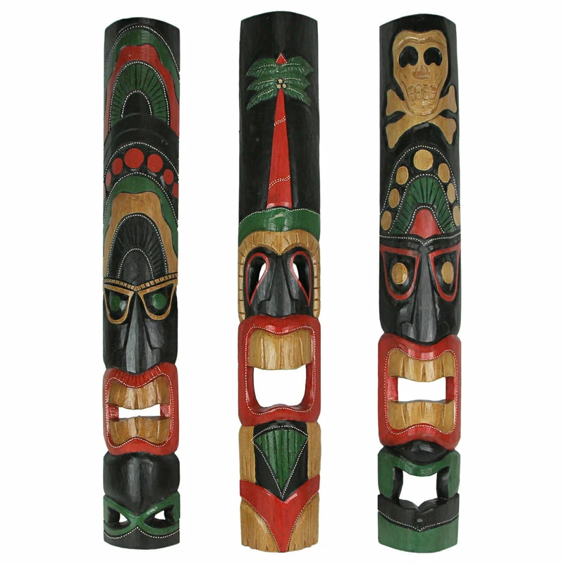 This set of 3 incredibly detailed primitive-style tiki masks adds the perfect tropical touch to any Polynesian-themed room, patio, or tiki bar! Each approximately 39.5-inch tall, 5.5-inch wide, and 4-inch deep mask is handcrafted by highly skilled artisans in Indonesia from Albesia wood, which is lightweight and easily replenished. The masks are hand-stained and hand-painted in colorful island hues that complement most existing decor, adding a fun accent wherever they are displayed, and easily attach to any wall from the loop hanger on the back. Note: Each piece is made by hand by skilled artisans in Indonesia, no two are exactly alike, making yours truly unique. Each set varies slightly in size, style, and color variations.