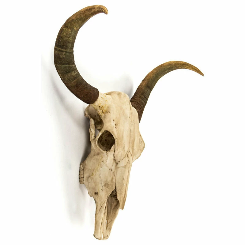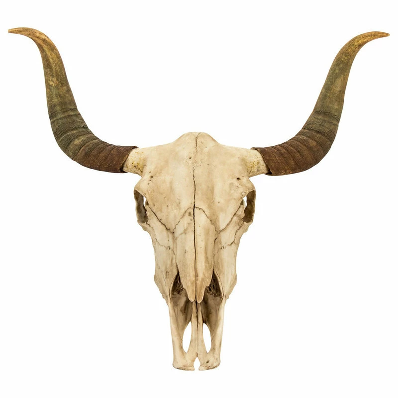 Decorate an entryway or living room wall with the unique Bull Skull Wall Decor. Made from distressed white polyresin, this fake skull is eye-catching and unique. Display it among pieces of Southwestern decor for a cohesive look.