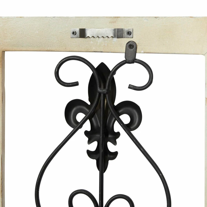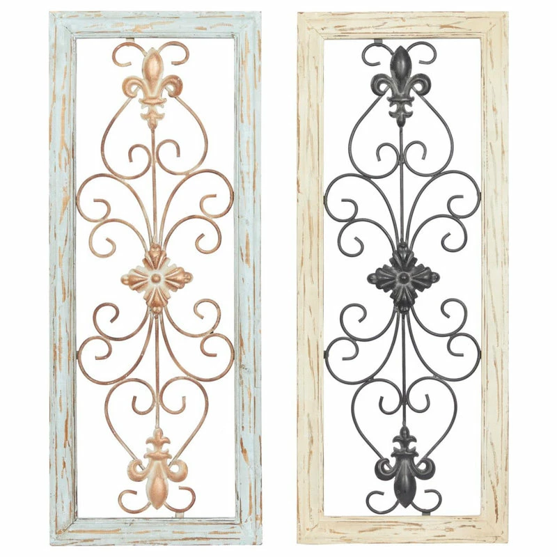 - The plaques share a scrolled metal pattern with fleur-de-lis designs.