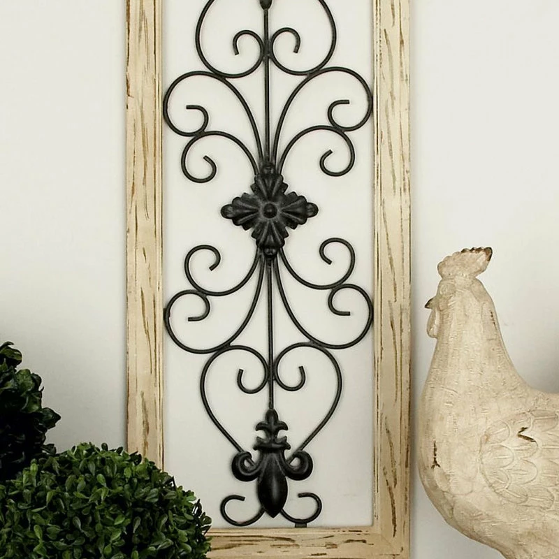 - Curved metal designs are mounted to the open wooden frames.