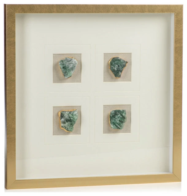 Add an elegant touch to your decor with this very unique framed crystals. The natural crystal wrapped in gold foil gives a sense of calming and harmony to your space. Set on a natural-colored linen-textured backing. The polystyrene frame is gold-tone finished and crystal is protected under glass. *Features a white floated top paper mat and natural crystal is mounted to a natural linen-textured bottom mat *Polystyrene gold finish frame *One sawtooth hanger attached to the back *Glass surface cover material *To clean glass, choose a non-abrasive commercial glass cleaner, or use warm water and a soft, lint-free cloth. Wring out excess water and wipe surface. Dry.